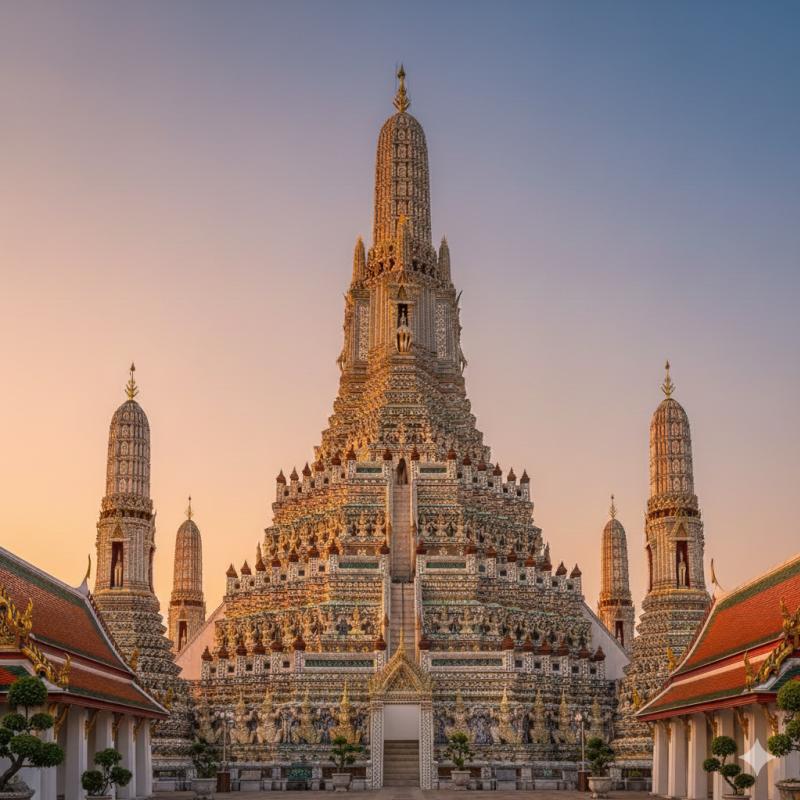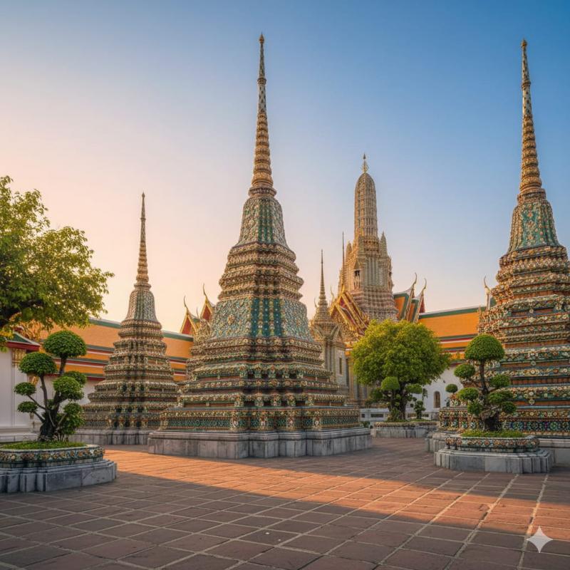 Return to Bangkok to explore two of the city's most magnificent temples. Visit Wat Pho (Temple of the Reclining Buddha), home to the impressive 46-meter-long gold-plated Reclining Buddha and over 1,000 Buddha images. This temple complex is also a center of traditional Thai medicine and massage education, showcasing intricate murals and stunning courtyards that date back to King Rama I and King Rama III.